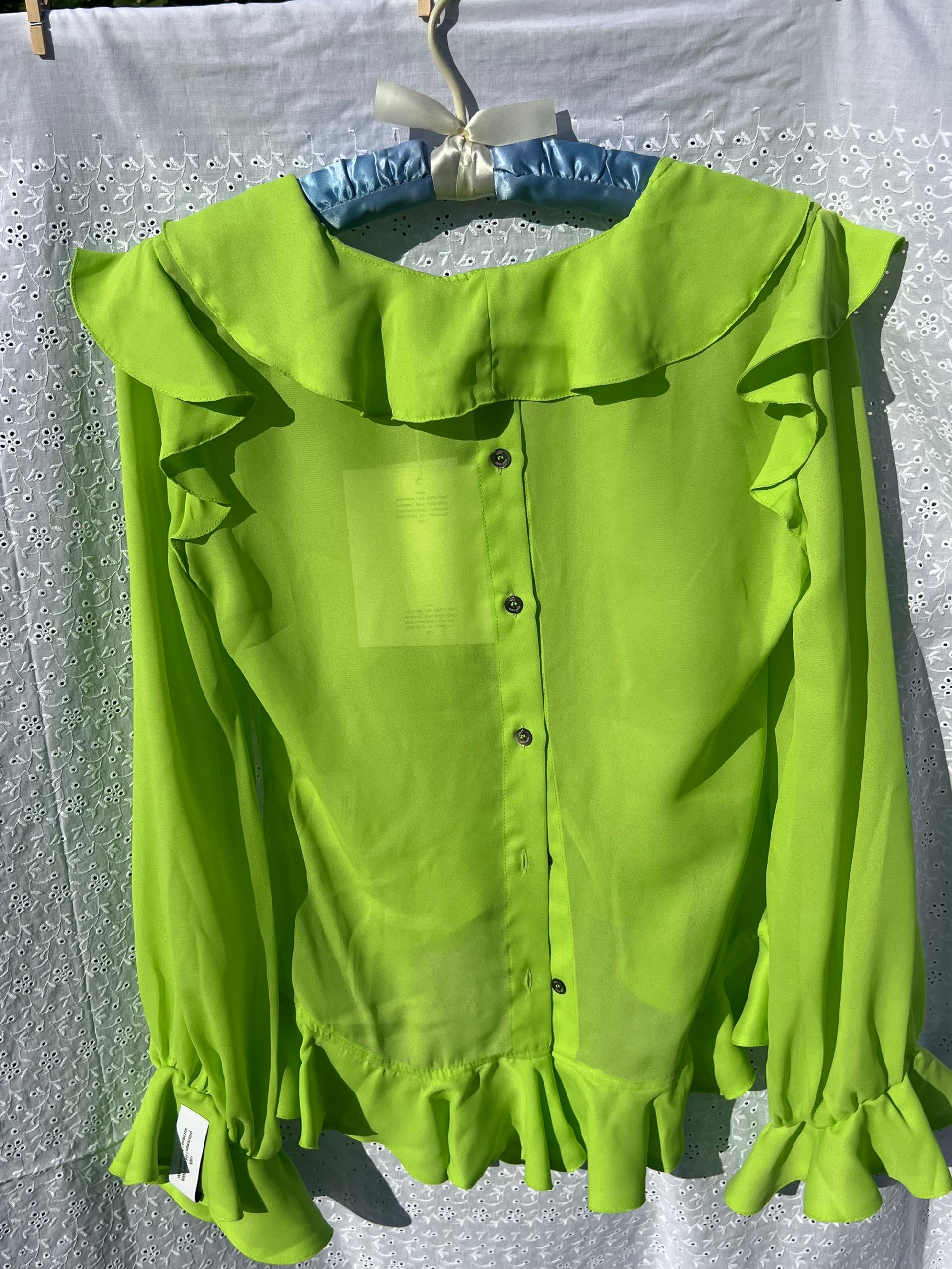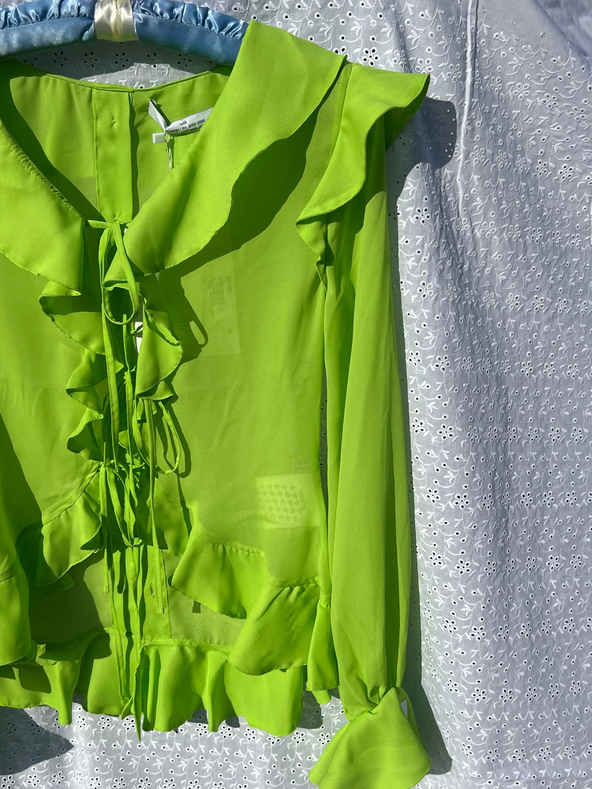 Neon green ruffled-detail blouse from ROKH featuring sheer, ruffled detailing, ruffle collar, ruffle cuffs, and long sleeves.