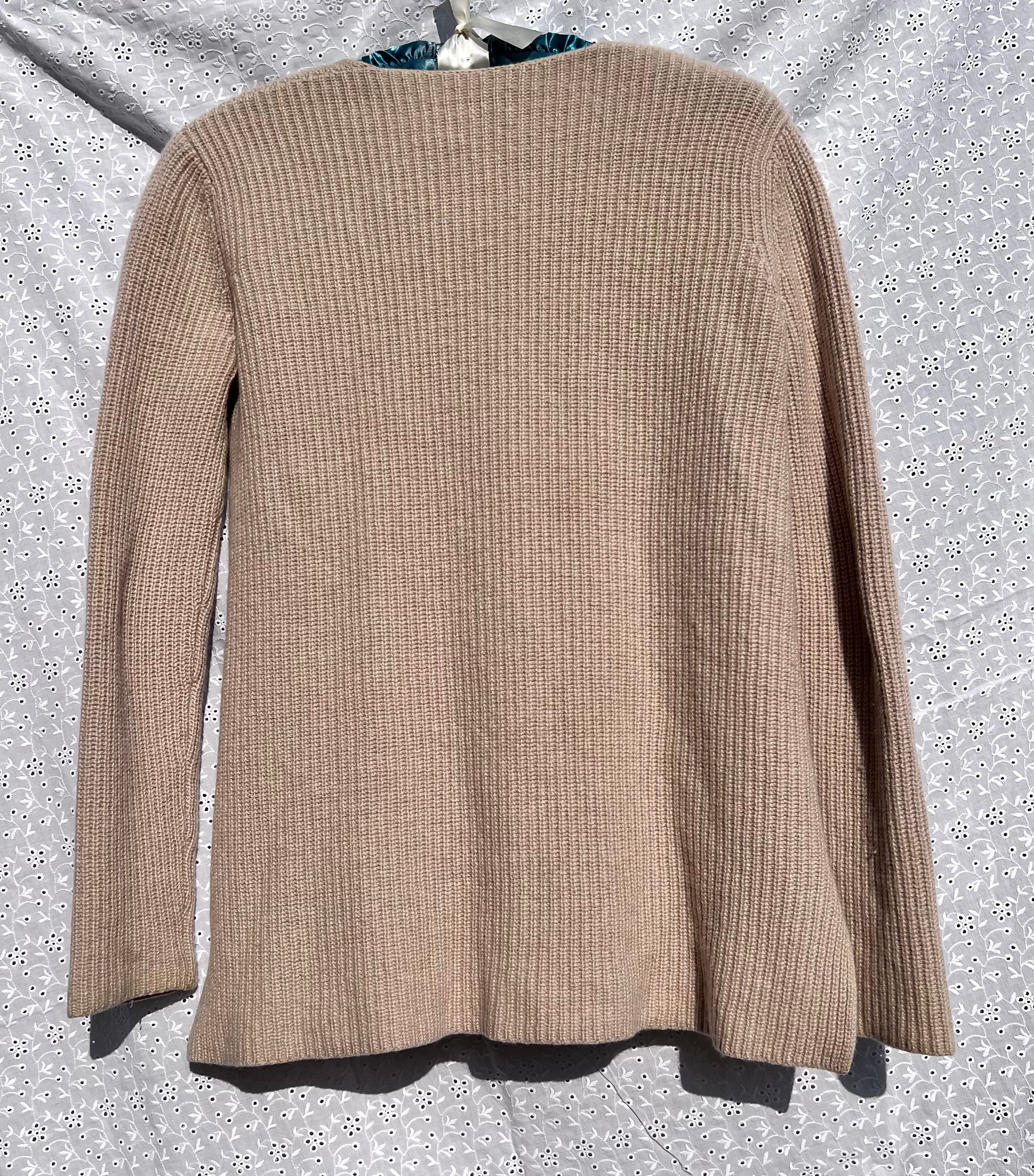 condition: imperfect beauty, the v neck strands are starting to stretch (see pics), but other than that this baby is 100% cashmere that is still soft and unblemished